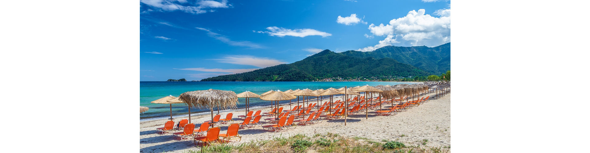 Golden Beach is one of the largest and most popular beaches on Thassos, loved for its long sweep of soft sand and shallow, sparkling water. Backed by green hills and a lively promenade of cafés, tavernas and beach bars, it’s a great spot for swimming, sunbathing and easy-going seaside strolls.